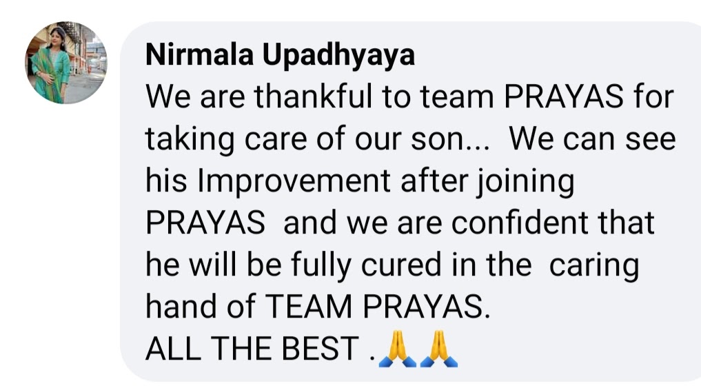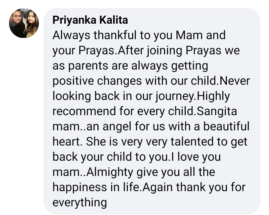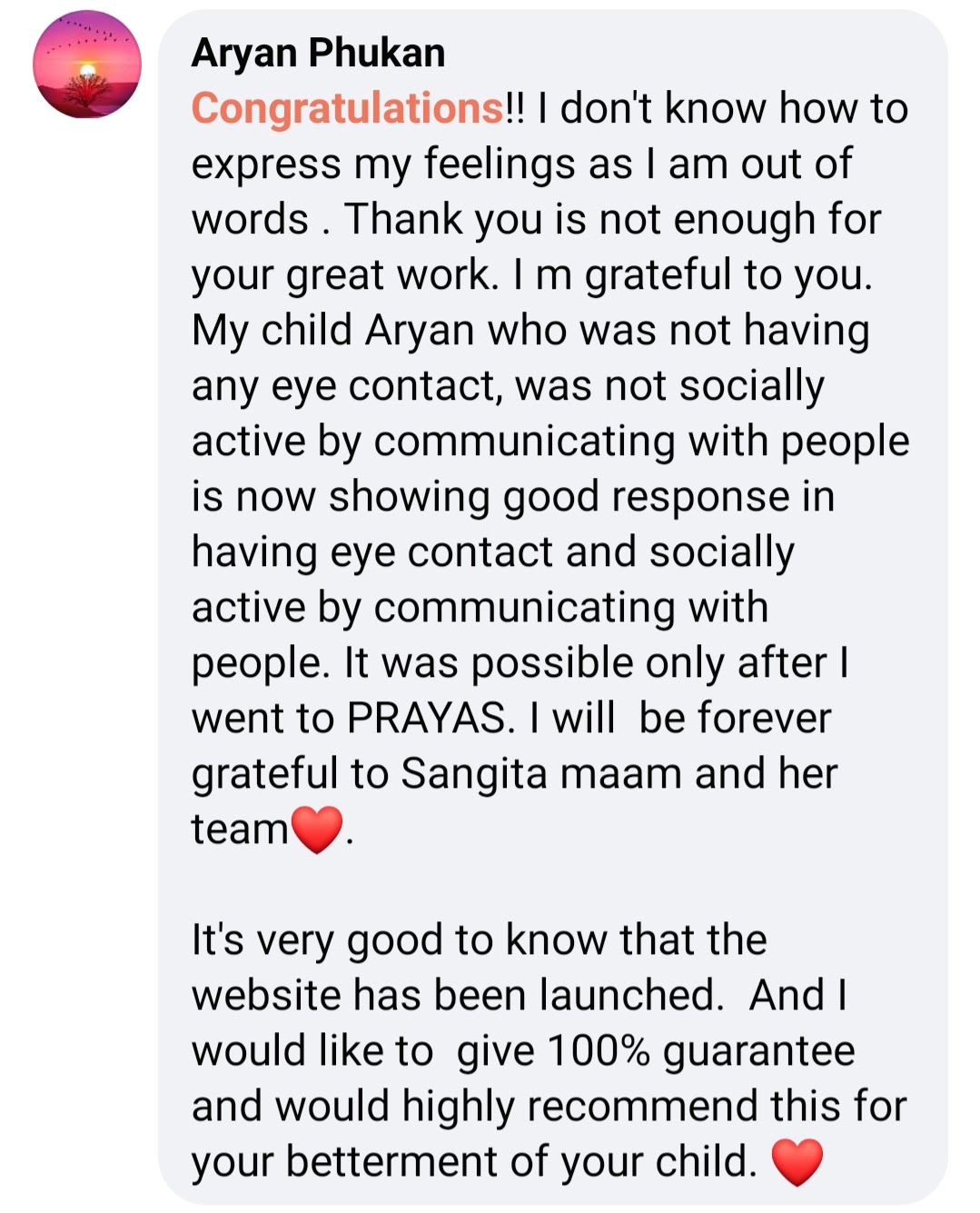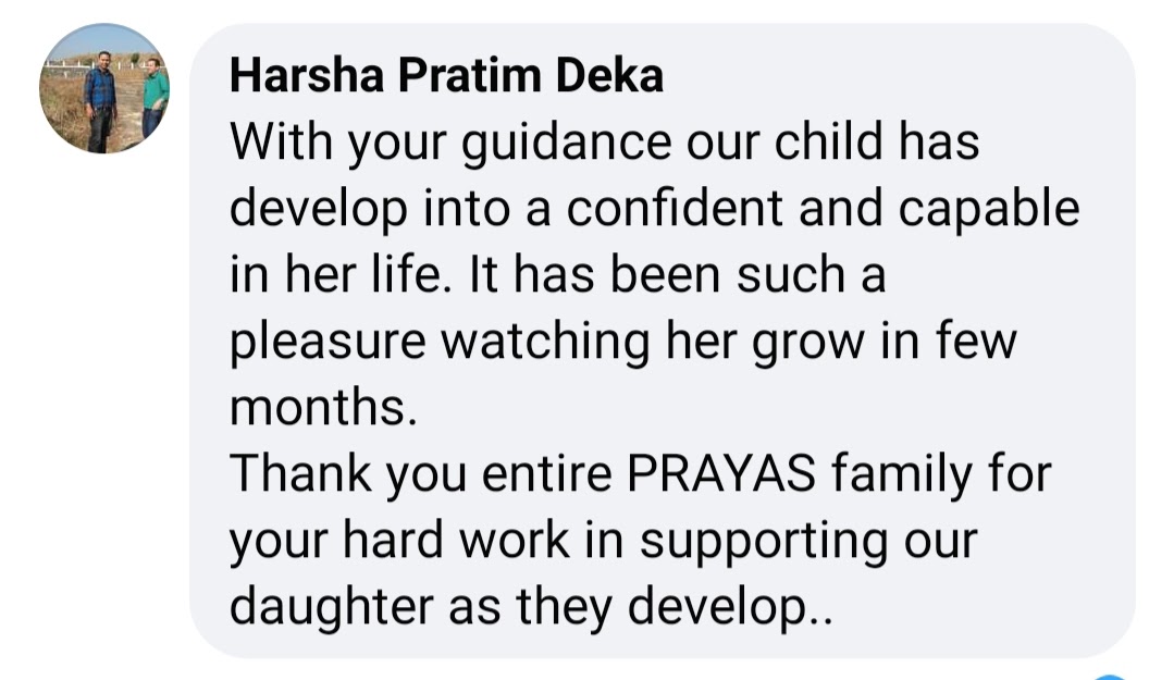 This is the feedback of a grandfather of a 3yrs old boy, who had come to PRAYAS with a moderate level of autistic behaviors. He had poor eye contact, name response and was not responding to commands. After 7 months of therapy, presently child has proper eye contact, can respond to name calling, and can follow commands.