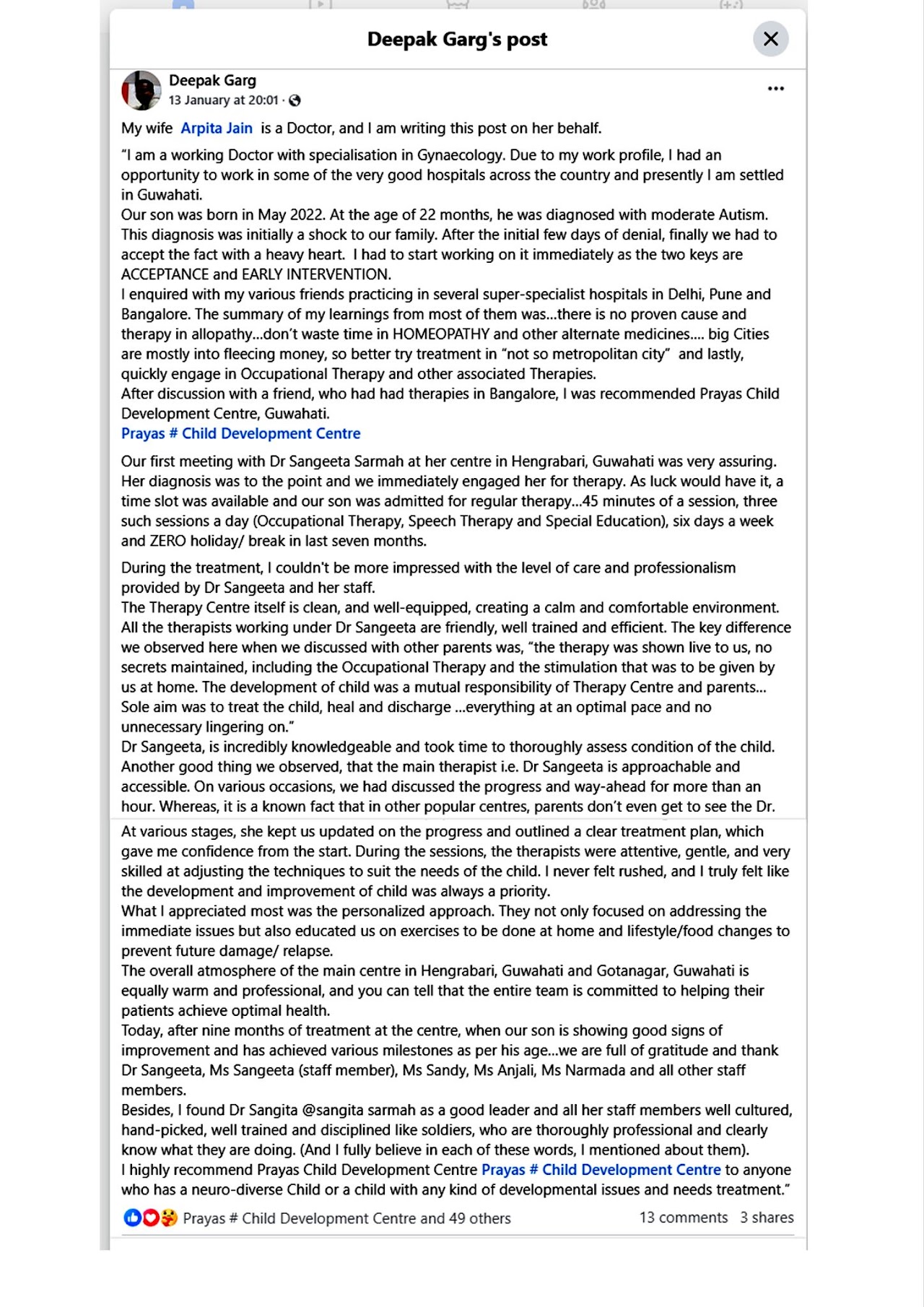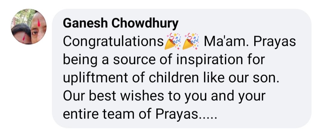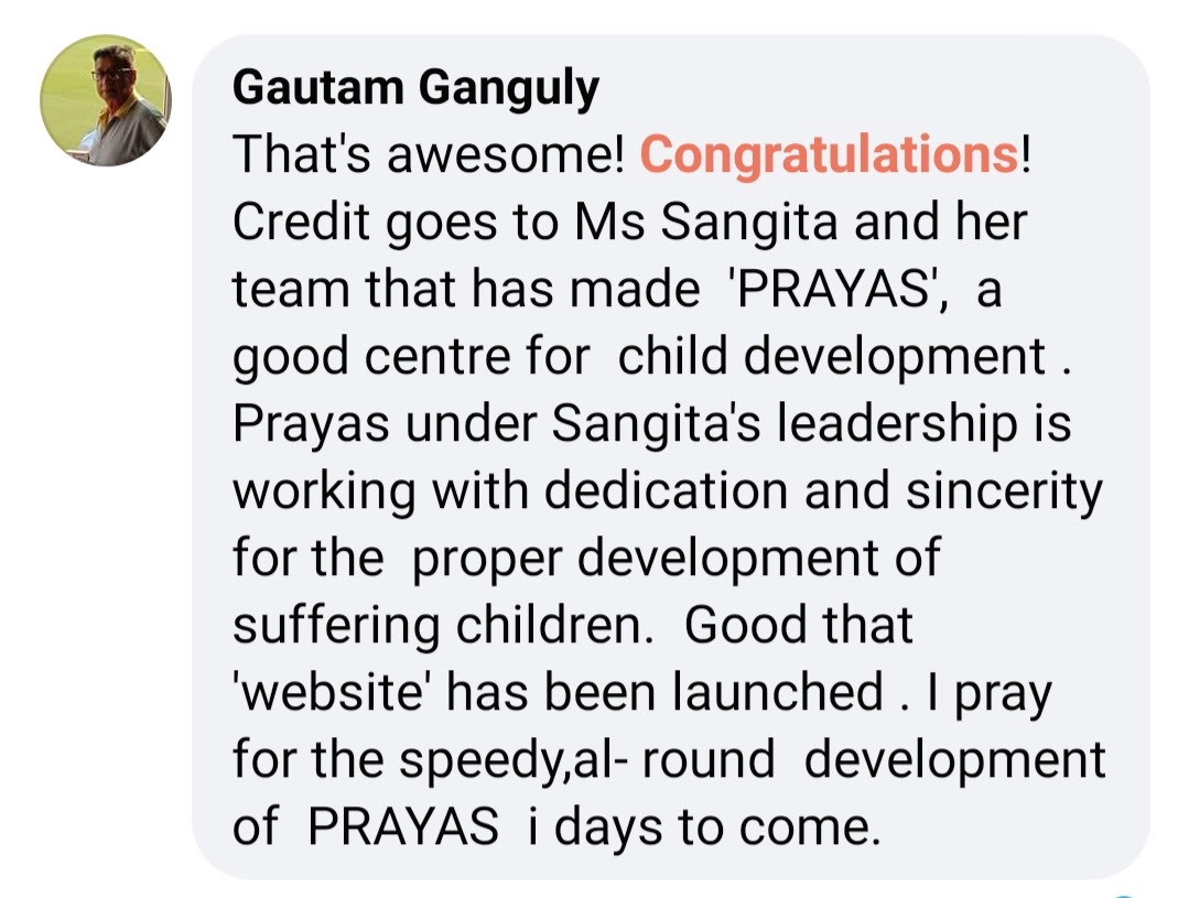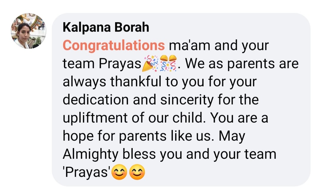 This is the feedback of a grandfather of a 3yrs old boy, who had come to PRAYAS with a moderate level of autistic behaviors. He had poor eye contact, name response and was not responding to commands. After 7 months of therapy, presently child has proper eye contact, can respond to name calling, and can follow commands.