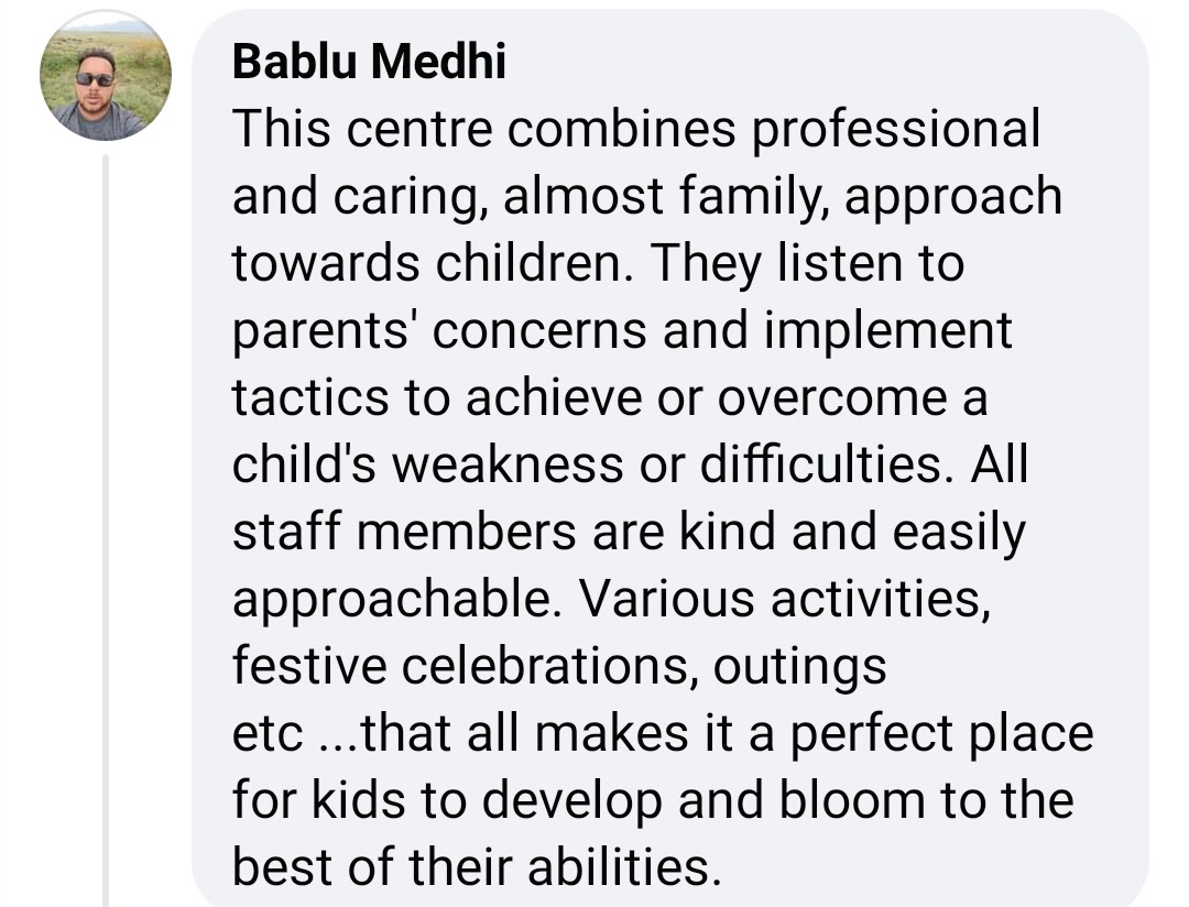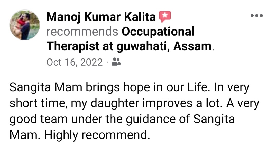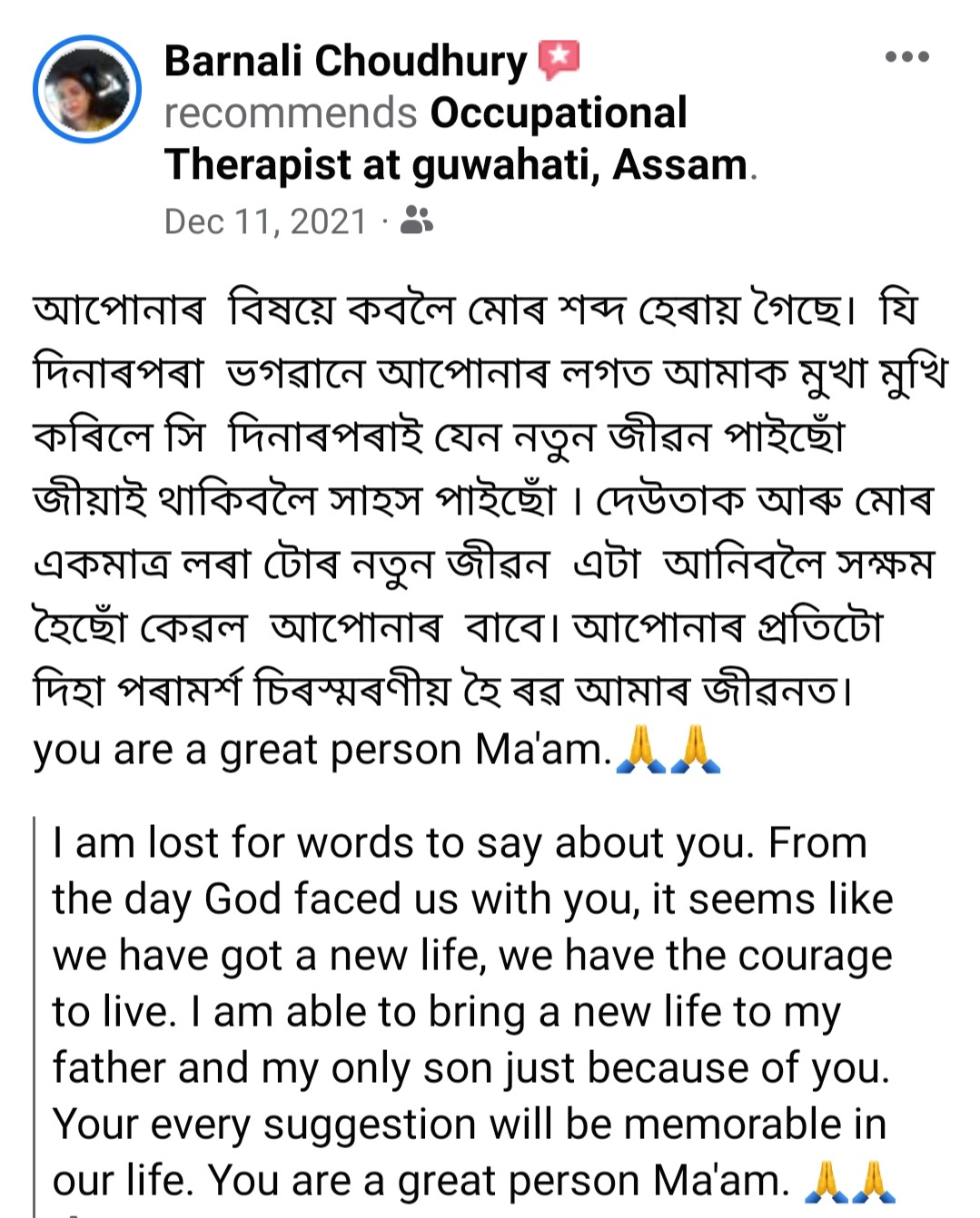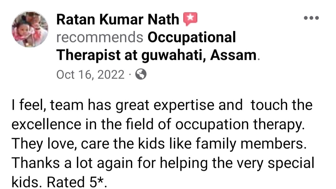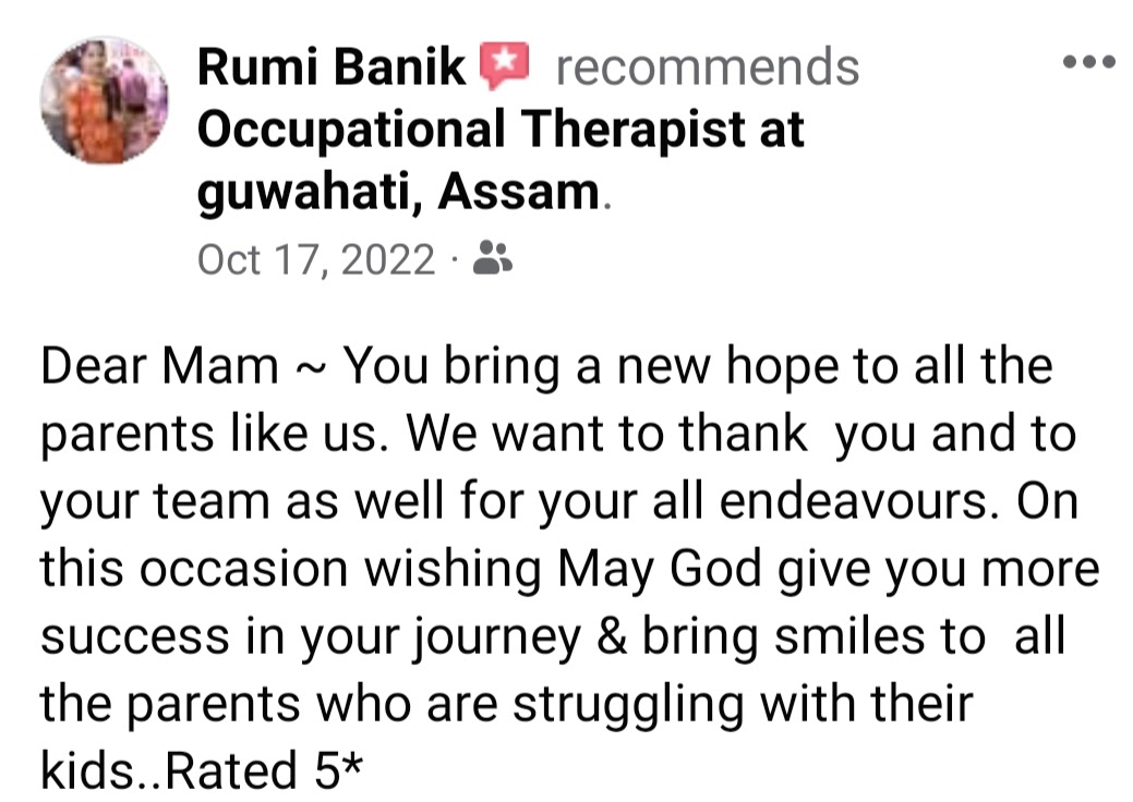 This feedback is given by a father of a 5 yrs old girl having autism. She had come with moderate level of autistic behaviors with poor eye contact, name response and command following. She had no speech, was unable to chew/swallow. She had excessive cry and afraid of new people. After almost 7months of therapy, presently she can communicate through 1-2 words, look at eyes, able to follow all commands and participate at social/group activities. Now she is writing independently and starts having solid food and able to chew & swallow.